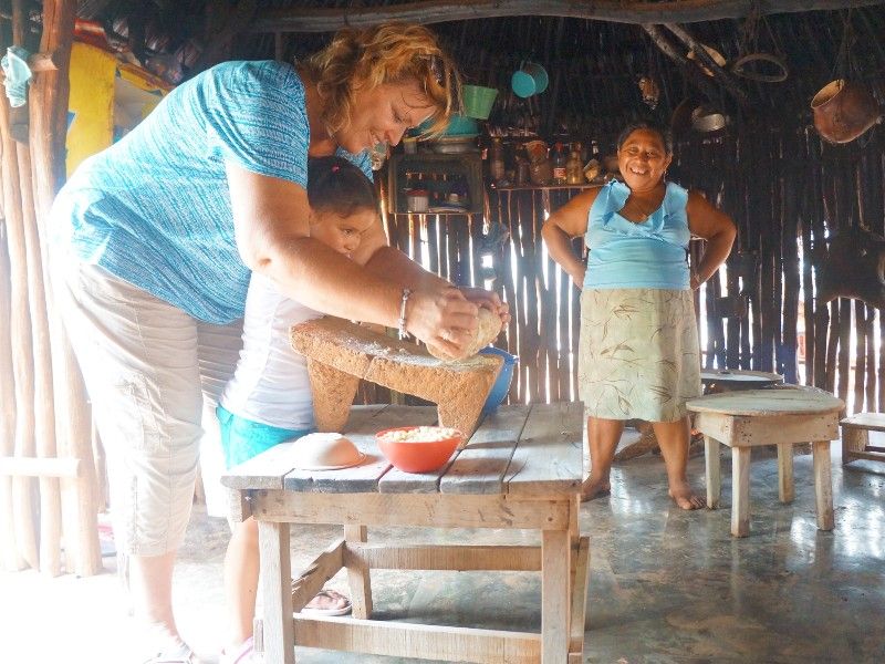 We halen onze huurauto op bij het lokale kantoortje en verruilen de levendige badplaats Playa del Carmen voor een klein Mayadorpje. In een rokerig, houten hutje met een rieten dak nemen we plaats op kleine krukjes. Nadat de goedlachse Guadalupe het een keer heeft voorgedaan, is het de beurt aan de kinderen om hun eigen tortilla’s te maken. Met een stenen vijzel wordt de maïs fijngemalen. We voegen water en een snufje zout toe en kneden het tot een balletje deeg dat we vervolgens plat slaan en op een bakplaat boven een houtvuurtje klaarmaken. Onze tortilla’s zijn een beetje misvormd, maar ze smaken heerlijk! Bij de buurvrouw zien we hoe het traditionele borduurwerk wordt gemaakt. Aan hun kleurrijke kleding is te zien tot welke subgroep de Maya’s behoren. Tot slot krijgen we een spoedcursus hangmat weven, want bedden vind je niet in deze traditionele dorpjes.